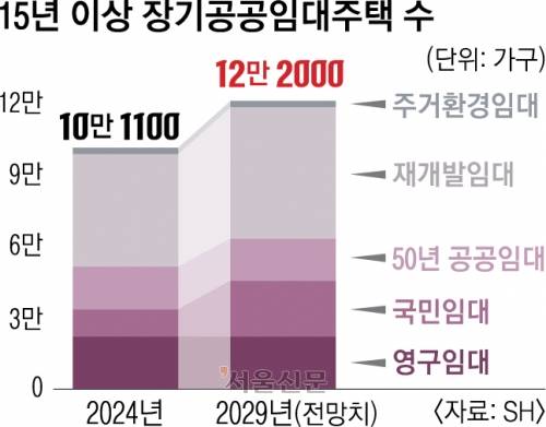 12일 서울연구원이 최근 발간한 '서울시 장기공공임대주택 입주자 삶의 질 향상 기본계획 수립을 위한 연구' 보고서에 따르면, 시와 SH가 관리하는 15년 이상 경과 장기공공임대주택은 2024년 10만 1100가구에서 2029년 12만 2000가구로 증가할 전망이다.