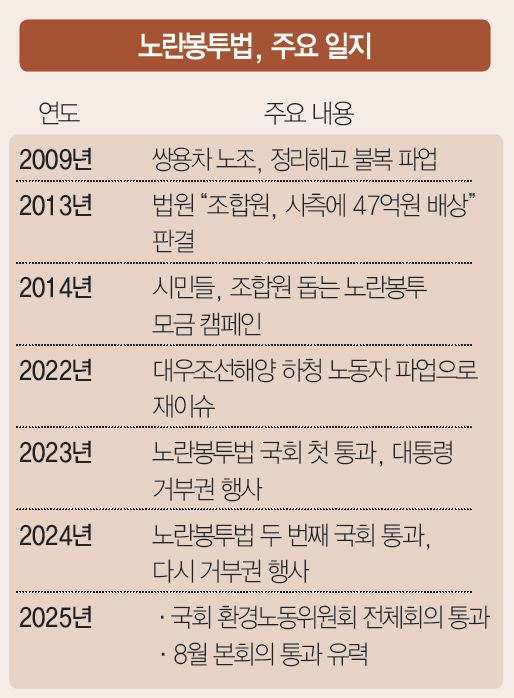 문재인 전 대통령은 대선 공약에 노란봉투법을 포함했지만 제대로 추진하지 못했다. 윤석열정부 시절 민주당은 21대, 22대 국회에 걸쳐 두 차례 노란봉투법을 발의해 국회 본회의를 통과했다. 하지만 윤석열 대통령이 거부권을 행사했고 국회에서 최종 법안이 부결됐다. 올 들어 여러 민주당 의원이 법안을 재발의했는데, 여대야소 형국인 만큼 변수 없이 국회를 통과할 것이란 전망이다.