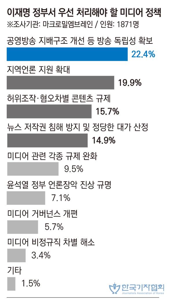 이재명 정부에서 우선적으로 처리해야 할 미디어 정책이 무엇인지도 물었다. 가장 많이 꼽힌 건 ‘공영방송 지배구조 개선 등 방송 독립성 확보’(22.4%), ‘지역 언론 지원 확대’(19.9%)였다. 방송 독립성 확보는 여러 매체에서 고른 지지를 받았지만, 특히 서울 소재 지상파방송사(42.5%)와 종편/보도채널(32.0%)에서 큰 차이로 1위였다. 지역 소재 지상파방송사에선 방송 독립성 확보(38.4%)와 지역 언론 지원 확대(36.3%)가 비슷하게 나타났다. 지역 종합일간지에선 지역 언론 지원 확대를 꼽은 비율이 62.4%에 달했다.
