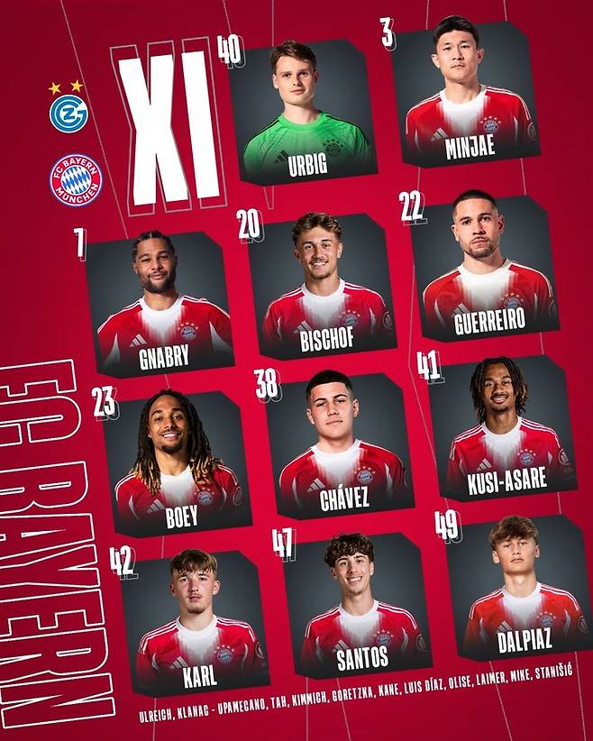 뮌헨의 빈센트 콤파니 감독은 벤치 자원을 적극적으로 활용한 가운데 김민재와 세르주 그나브리, 하파엘 게헤이루 등 일부 주전급 선수들은 선발 명단에 이름을 올렸다.