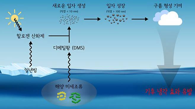 DMS는 북극 미세조류가 내뱉는 황 성분의 기체로, 형성된 지 1년 미만의 해빙인 일년빙에서 주로 방출되는 할로겐 산화제와 반응해 미세입자 생성에 기여하는 것으로 분석됐습니다.
