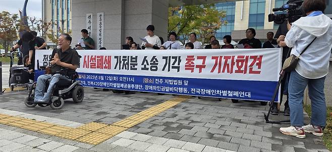 | ▲ 전주지방법원에서 기자회견을 하는 전북장차연 시설 폐쇄 명령에 대한 가처분 신청을 한 정읍 화평의 집 시설장을 규탄한다 |