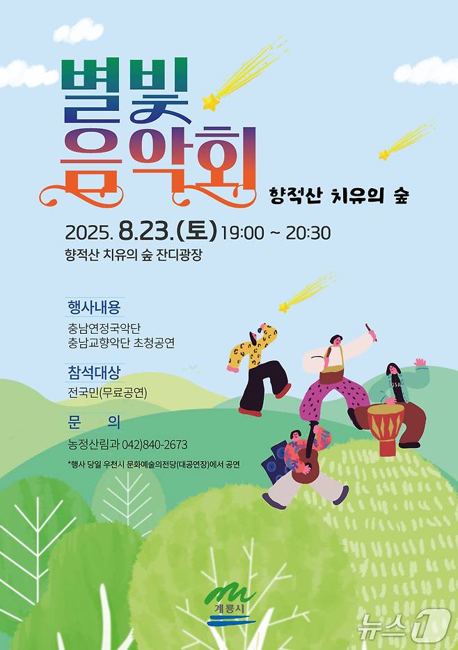 충남 계룡시는 오는 23일 오후 7시부터 8시 30분까지 향적산 치유의 숲 잔디광장에서 '향적산 치유의 숲 별빛음악회'를 개최한다고 13일 밝혔다.