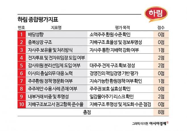 13일 아시아경제가 시가총액 기준 상위 20개 식품·음료 상장사를 대상으로 지배구조 평가지표 10개 항목에 따라 정량·정성 평가를 실시한 결과, 하림은 20점 만점 중 8점에 그쳤다. 이는 20개 식품 상장사 평균(10.8점)보다 낮은 하위권이다. 특히 중복상장, 주주제안 수용 여부, 배당성향 등 핵심 항목에서 '0점'을 받았다.