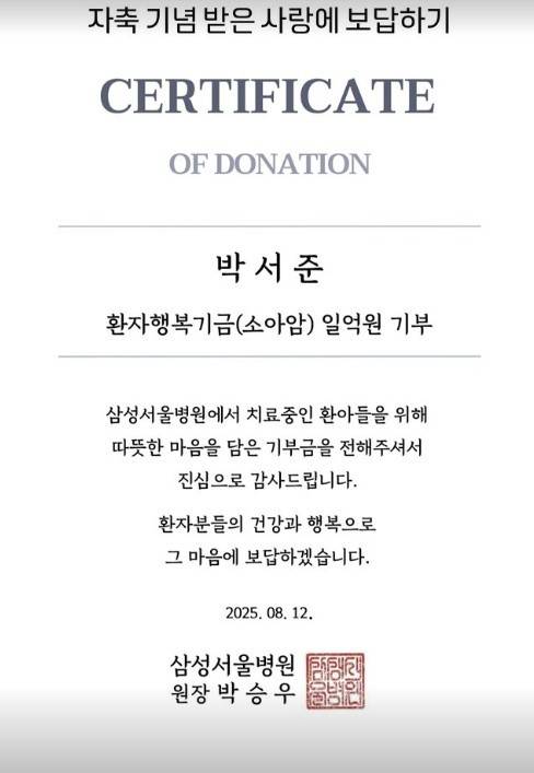 박서준은 지난 12일 삼성서울병원에 환자행복기금 1억 원을 기부했다. 소아암 투병 중인 환아들을 위해 마음을 전했다. 이날 SNS에 기부 증서도 공개했다.