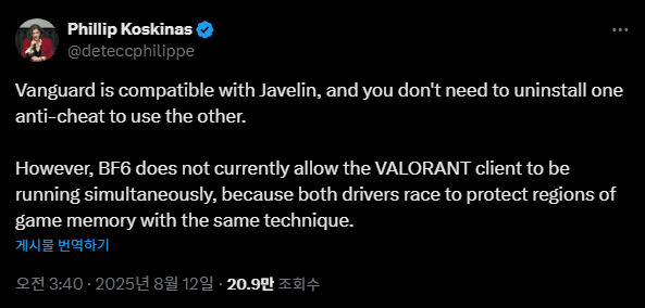 12일 필립 코스키나스 라이엇게임즈 안티치트 책임자는 자신의 X에서 "뱅가드와 재블린은 서로간 호환이 가능하지만 배틀필드6와 발로란트를 동시에 키는 건 불가능하다"라며 "두 드라이버가 같은 방식으로 게임 메모리 영역을 보호하려다 보니 서로 충돌이 발생했다"라고 설명했다.