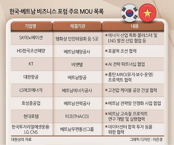 이날 체결된 MOU는 에너지뿐만 아니라 조선, 인공지능(AI), 항공, 철도 등 다양한 사업을 아울렀다. HD한국조선해양은 베트남 최대 국영 해운사인 베트남해양공사(VIMC)와 베트남 조선업 발전 촉진을 골자로 한 포괄적 조선 협력에 관한 MOU를 맺었다.