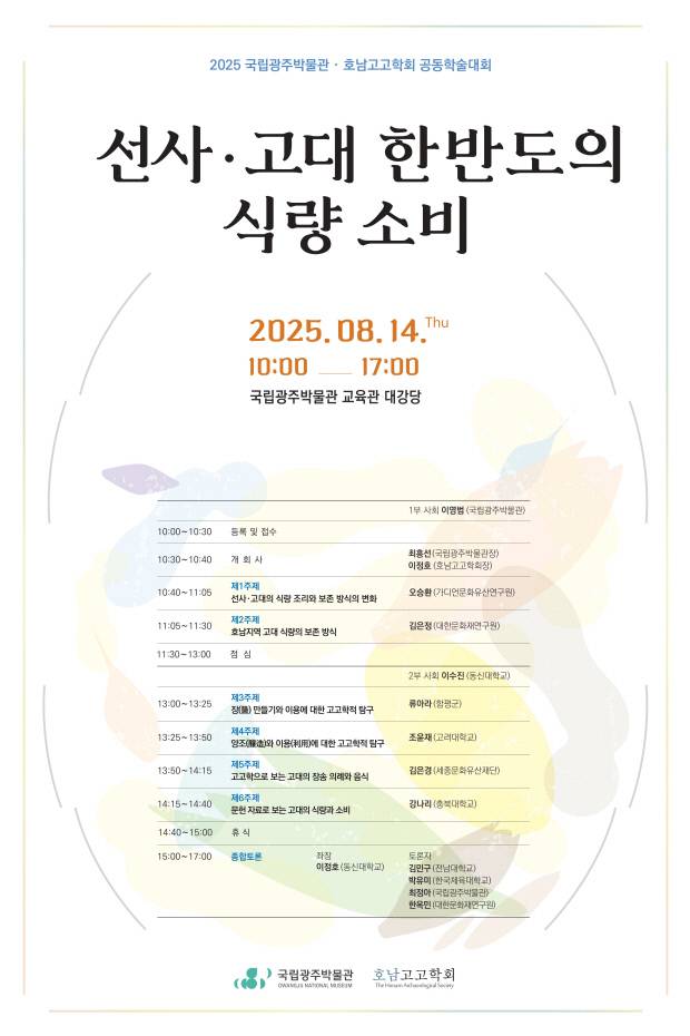 1부에서는 가디언문화유산연구원 오승환이 '선사·고대의 식량 조리와 보존 방식의 변화'를, 대한문화재연구원 김은정이 '호남지역 고대 식량의 보존 방식'을 발표한다.