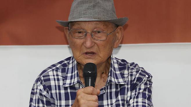 ▲ 비전향장기수 안학섭 씨가 13일 서울 종로구 모처에서 열린 '전쟁포로 안학섭 판문점 송환 일정 중대 발표 기자회견'에서 발언하고 있다.