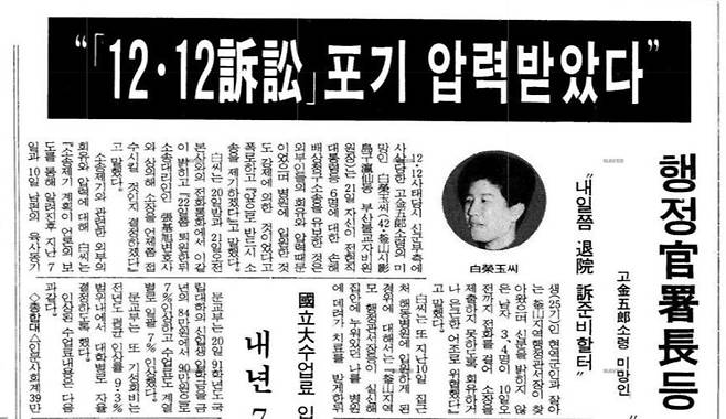| ▲ 1990년 12월 21일 자 <동아일보> 기사 '12.12訴訟(소송)포기 압력받았다'에 백영옥씨가 신군부로부터 받은 압박 및 회유의 내용이 소개됐다. |