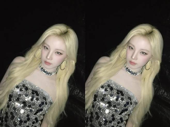 사진 속 우기는 화려한 은빛 톤의 의상과 매끈한 금발 헤어로 신비로운 분위기를 연출했다.