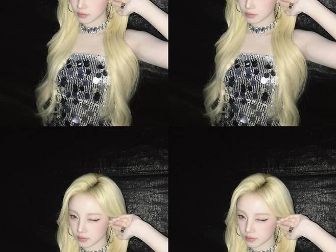 사진 속 우기는 화려한 은빛 톤의 의상과 매끈한 금발 헤어로 신비로운 분위기를 연출했다.