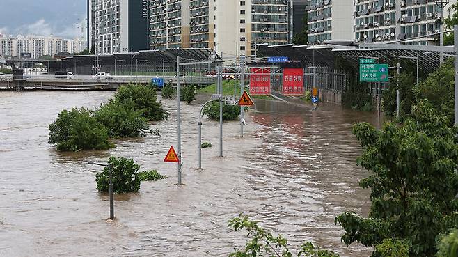 ▲ 폭우가 내린 13일 서울 노원구 월계1교 인근 중랑천에 홍수주의보가 발령돼 동부간선도로가 물에 잠겨있다.