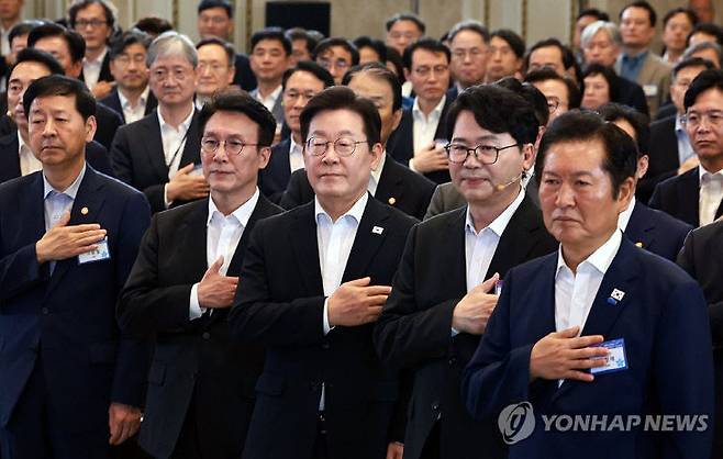 | 이재명 대통령이 13일 청와대 영빈관에서 열린 국정기획위원회 국민보고대회에서 국기에 경례하고 있다. 오른쪽부터 더불어민주당 정청래 대표, 이한주 국정기획위원장, 이 대통령, 김민석 국무총리, 구윤철 경제부총리 겸 기획재정부 장관. |
