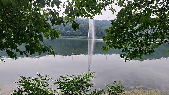 | ▲ 한가로움 저수지 한 가운데서 분수가 솟아오른다. 한가로운 풍경이다. |
