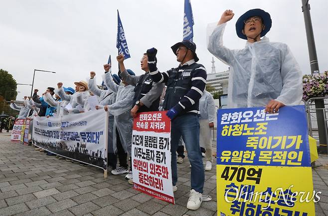 | ▲ 금속노조 주최로 지난해 10월 18일 서울 용산구 대통령실 앞에서 열린 '한화오션 하청노동자 51일 파업은 무죄다. 기자회견'이 열렸다. 참석자들은 "지금 한국사회가 해야 하는 일은 조선소 하청노동자의 절박한 외침에 귀 기울이는 것이지 범죄자로 몰아 중형을 구형하고 형사처벌하는 것이 아니며, 비정규직 노동자도 헌법이 보장하는 노동3권을 실질적으로 누릴 수 있도록 하는 것이지 이들을 감옥에 가두는 것이 아니다"라며 파업 투쟁의 정당성과 무죄를 주장했다. |