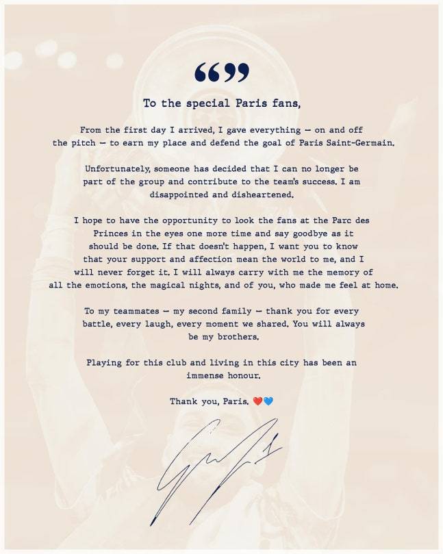이어 “파르크 데 프랭스(PSG 홈구장)에서 팬들과 작별할 기회가 있기를 바란다. 그렇지 않더라도 여러분이 보여준 응원과 애정은 제 인생의 전부였다”고 감사를 전했다. 동료들에게도 “함께한 모든 경기와 웃음, 그리고 추억을 영원히 간직하겠다. 파리에서 뛴 것은 영광이었다”고 고별사를 남겼다.