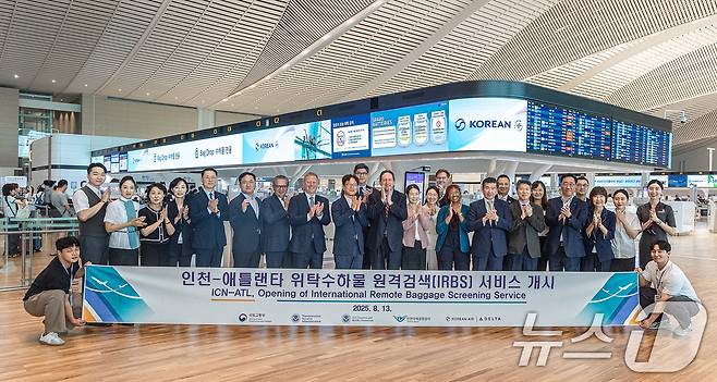 13일 인천국제공항 제2여객터미널 대한항공 카운터에서 국토교통부와 미국 교통보안청(TSA), 대한항공·델타항공 주요 관계자들이 IRBS 시행 첫날을 기념해 사진을 촬영하고 있다. (대한항공 제공. 재판매 및 DB 금지) 2025.8.13/뉴스1
