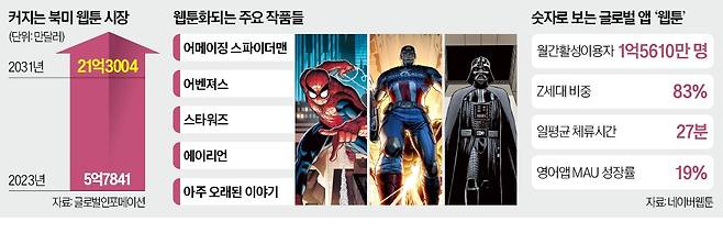 ‘스타워즈’ ‘어벤져스’ 등이 네이버웹툰의 글로벌 플랫폼에서 세로 스크롤 형태의 웹툰으로 재탄생한다. 네이버의 미국 웹툰 자회사인 웹툰엔터테인먼트가 월트디즈니컴퍼니와 손잡고 디즈니 대표작 100편을 새롭게 웹툰으로 제작해 자체 영어 플랫폼인 ‘웹툰(WEBTOON)’ 앱에 독점 공개하기로 했다. 전 세계적으로 인기가 높은 ‘슈퍼 지식재산권(IP)’이 K플랫폼을 통해 형식을 바꿔 대규모로 유통되는 첫 사례다.
