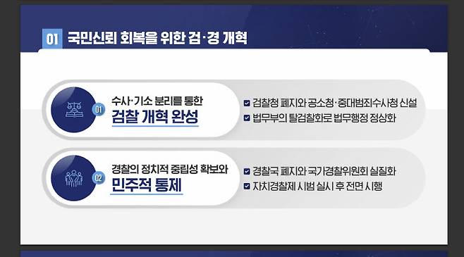 이해식 국정위 정치행정분과장은 “표적수사 등으로 그동안 권한을 남용한 검찰청은 폐지하겠다”며 “중수청·공소청으로 수사와 기소를 분리하고 법무부의 탈검찰화로 법무행정을 정상화해 검찰개혁을 완성하겠다”고 설명했다.