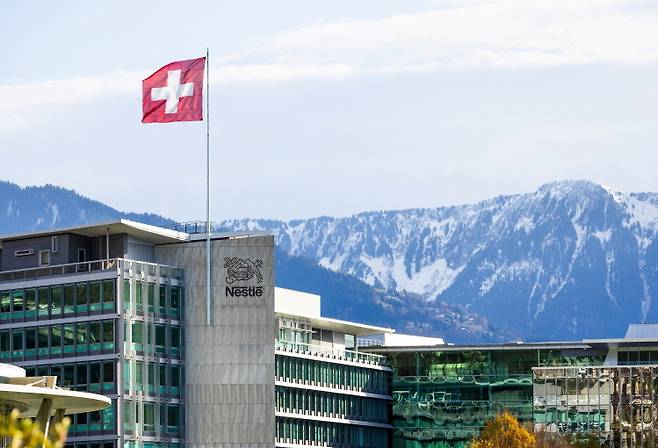 [스위스 베베의 네슬레 본사에 걸린 스위스 국기 (로이터=연합뉴스 자료사진)]