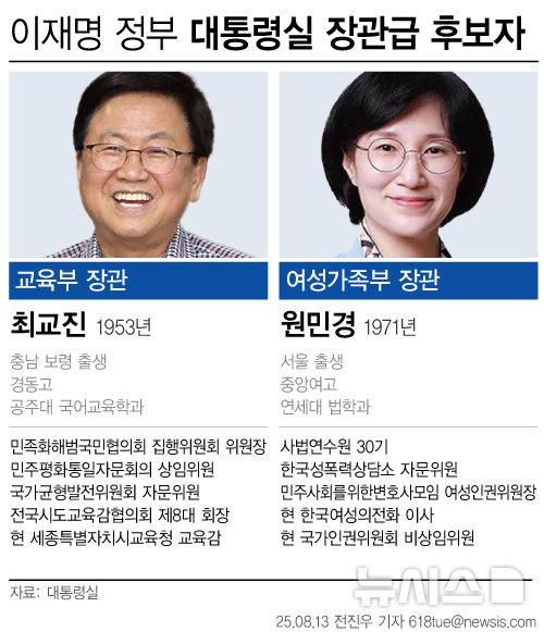 [서울=뉴시스] 13일 이재명 대통령은 교육부와 여성가족부 장관 후보자 등 장관급 6명에 대한 내정 인사를 단행했다. 교육부 장관에 최교진 세종시교육감이, 여성가족부 장관은 원민경 변호사가 내정됐다. (그래픽=전진우 기자)