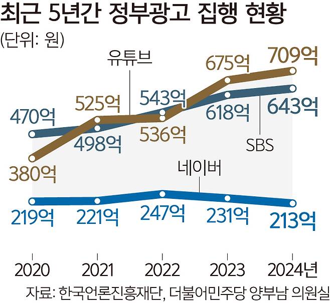 정부는 2020년 유튜브에 380억3600만원의 광고비를 집행했는데 4년 새 정부 발주 유튜브 광고비가 두 배 가까이 늘어난 셈이다.
