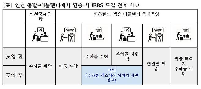 다른 국가나 지역에서 출발해 IRBS를 도입한 인천~애틀랜타 노선을 이용하는 경우에도 수하물 검색 간소화 혜택을 누릴 수 있다. 최초 출발지에서 수하물을 부친 뒤 항공편을 갈아타고 최종 목적지에서 수하물을 찾으면 된다.