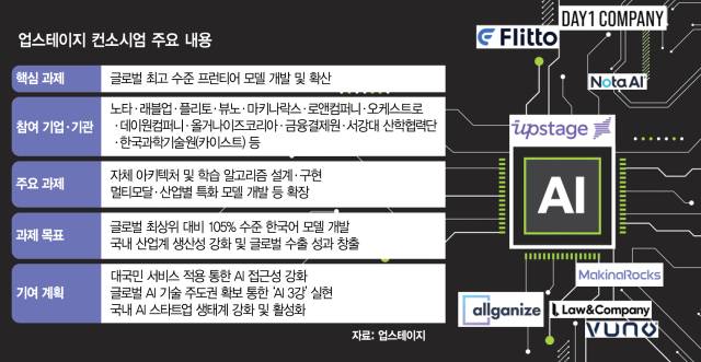 업스테이지 컨소시엄에는 다수의 AI 개발 스타트업이 참여하고 있다. 업스테이지를 비롯해 노타, 래블업, 플리토(300080) 등이 대표적이다. 노타는 그래픽처리장치(GPU) 최적화, 래블업은 GPU 분할 가상화, 플리토는 AI 데이터 분야를 맡았다. 또 서강대와 카이스트 등 학계에서도 참여해 그동안의 AI 분야 연구·개발(R&D) 성과를 공유할 예정이다.