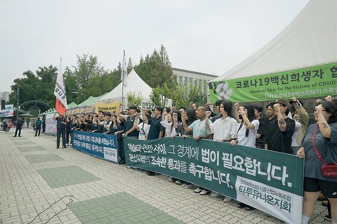 화섬식품노조 타투유니온지회 조합원 등 60여 명이 11일 오전 11시 국회의사당 앞에서 문신사법의 조속한 입법절차 이행을 촉구했다.