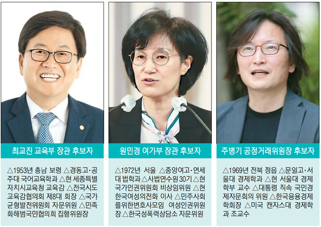 교육부 장관 후보자에는 최교진 세종시교육청 교육감을 지명했다. 최 장관 후보자는 중학교 교사부터 교육감까지 40여 년 헌신한 교육 전문가다. 여성가족부 후보자로는 원민경 변호사가 이름을 올렸다. 원 후보자는 민변 여성인권위원장을 지낸 바 있다.
