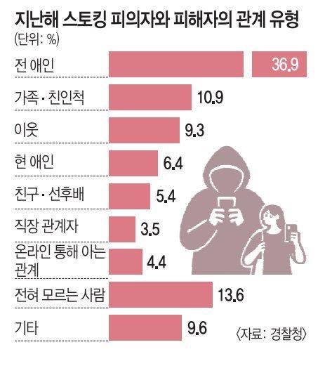 13일 경찰청이 서범수 국민의힘 의원실에 제출한 자료에 따르면 지난해 경찰이 집계한 스토킹 피의자 1만2664명 중 전 연인이 4668명(36.9%)으로 가장 많았다. 가족·친인척(10.9%), 이웃(9.3%), 현 애인(6.4%) 등이 뒤를 이으며 피해자와 친밀하거나 생활 동선을 알 만한 사람이 대부분이었다. 평소 모르는 사이는 13.6%에 불과했다.