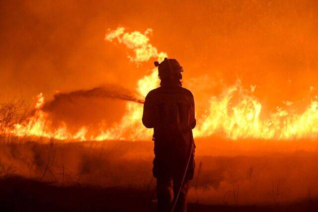 스페인 북서부 지역 한 마을에서 12일(현지시간) 소방관이 산불을 진압하고 있다. 스페인 각지에서 산불이 발생해 1명이 화상으로 숨지고 수천명이 대피했다. 몬테네그로에서도 산불 진압 중 군인 1명이 사망했다. 전국에서 100건 이상의 산불이 발생한 그리스는 유럽연합(EU)에 지원을 요청했다. AFP연합뉴스