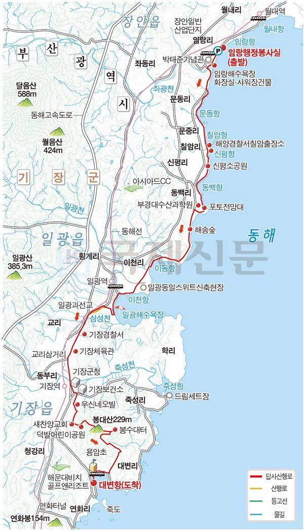 원래 해파랑길과 갈맷길은 신축 중인 일광도서관으로 삼성천을 따라가게 되어 있다. 취재팀 답사 때는 도서관 공사가 다 안 끝나 길이 폐쇄돼 있어 할 수 없이 도로(일광로)를 우회했다. 14번 국도인 기장대로가 지나가는 일광과선교 앞에서 왼쪽이며, 기장대로를 따라 걷는다. 기장경찰서 기장체육관을 차례로 거쳐 교리 삼거리에서 직진한다. 일광해수욕장에서 40분 남짓이면 기장군청 앞이다. 기장군의회 건물을 오른쪽으로 돌아 돌계단을 올라가면 죽성리 가는 도로와 만난다. 왼쪽이다.