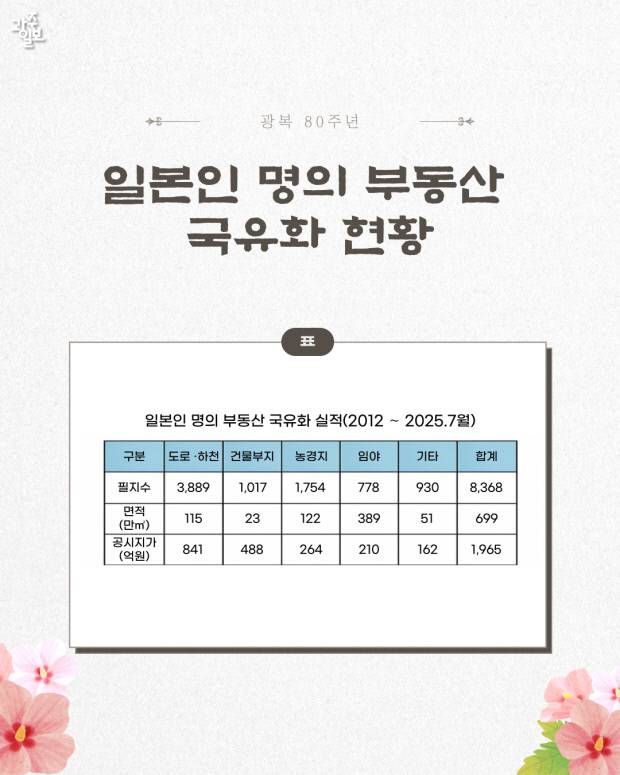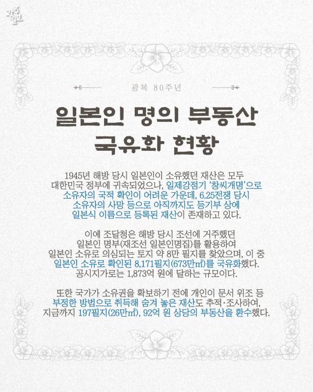 일본인 소유로 의심되는 토지 약 8만 필지 중 일본인 소유가 확인된 8171필지(673만㎡)를 국유화했고, 이는 공시지가로 1873억 원에 달하는 규모입니다.