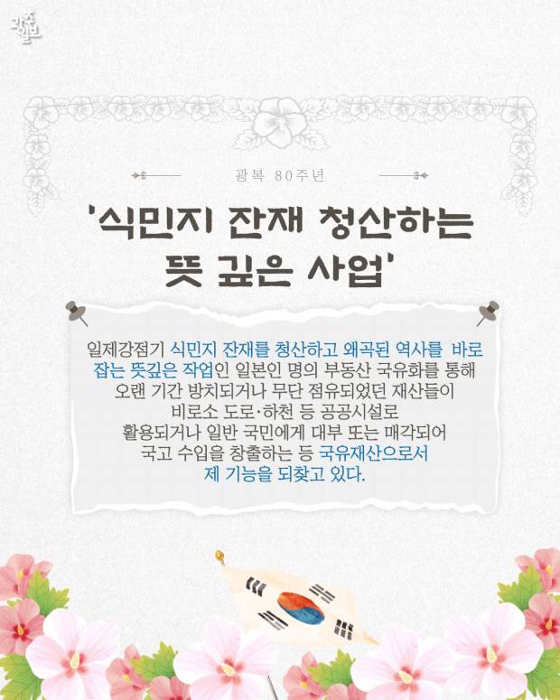 조달청은 2012년부터 식민지 잔재 청산을 위해 토지대장과 부동산등기부 등에 일본인·일본기관·일본법인 명의로 된 부동산을 국유화하는 사업을 진행하고 있습니다.