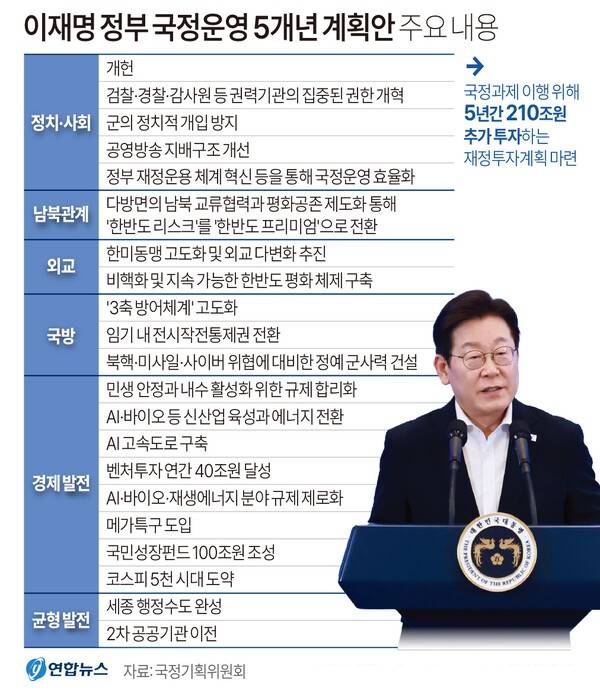 대통령 직속 국정기획위원회는 이날 청와대에서 '이재명 정부 국정운영 5개년 계획'을 발표했다. 계획안에는 개헌, 권력기관 개혁, 국방개혁, 인공지능(AI)·바이오 산업 육성, 불평등 해소 등 123대 국정과제가 포함됐다. 지자체별 현안과 이 대통령의 지역 연설 내용, 공약 등을 바탕으로 한 시도별 7대 공약 및 15대 추진과제도 제시됐다. 경남은 부·울·경 30분 시대를 앞당기기 위해 광역GTX망 구축의 부전-마산 복선전철 조기 개통, 부산-양산-울산 광역철도 건설 지원과 동남권 철도 사업을 차질 없이 준비하고, 거가대교, 마창대교 등 민자사업 재구조화를 통한 이용자 부담 완화 등이 포함됐다.