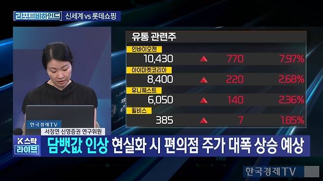 서정연 신영증권 연구위원은 "담배 값 인상이 현실화될 경우 편의점 주가에 긍정적"이란 의견을 내놨다. 서 연구위원은 13일 한국경제TV에서 유통주 하반기 전략에 대해 묻자 "주요 변수를 살펴보는 게 필요하다"며 이 같이 말했다.