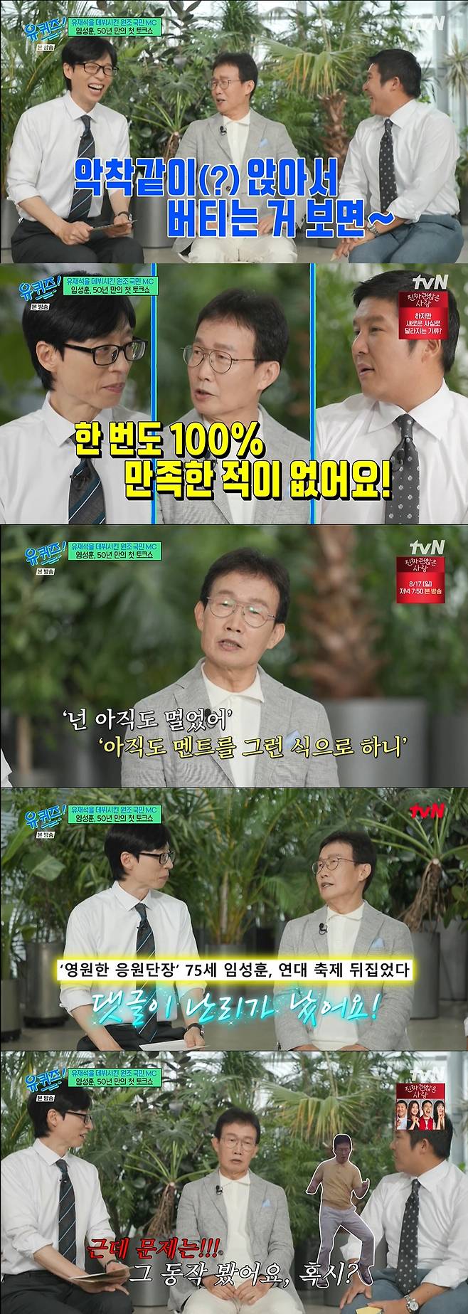 이후에도 허전함을 느꼈던 임성훈은 "녹화날마다 약속을 잡고 나갔다. 한 가지 일을 50년하는 게 보람있고 좋았는데 그만 둔 다음에 뭘할까가 어렵더라. 미리 준비해놨음 좋았을텐데 못했다. 아직까지 해답을 찾고 있다"라 했고 유재석은 "오늘 나와서 해주신 이야기를 들으면서, '끝'에 대해 생각이 든다"라 공감했다.