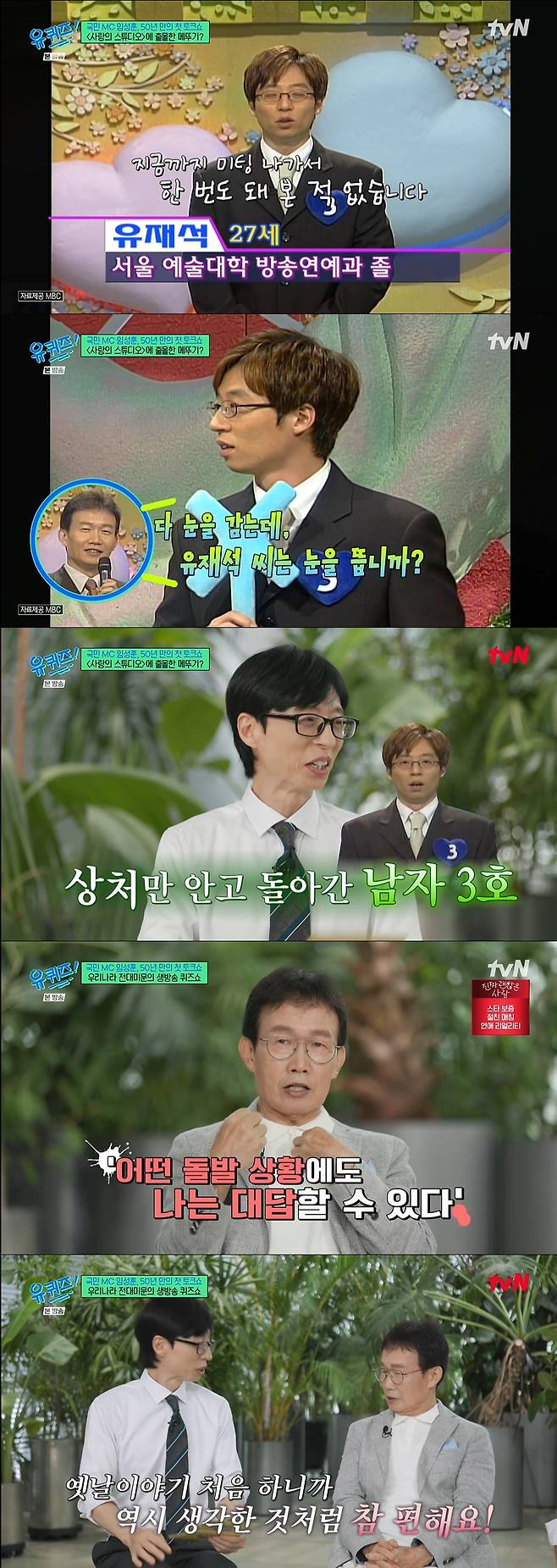 임성훈은 신혼여행도 방송차 부산으로 갔다고. 그는 "내가 방송하는 사이 아내 혼자 부산을 구경하다가 끝나고나서야 같이 놀고 서울에 곧장 올라왔다"라 했고 유재석은 "요즘엔 그러면 인터넷에 글 올라온다"라고 빵 터졌다.