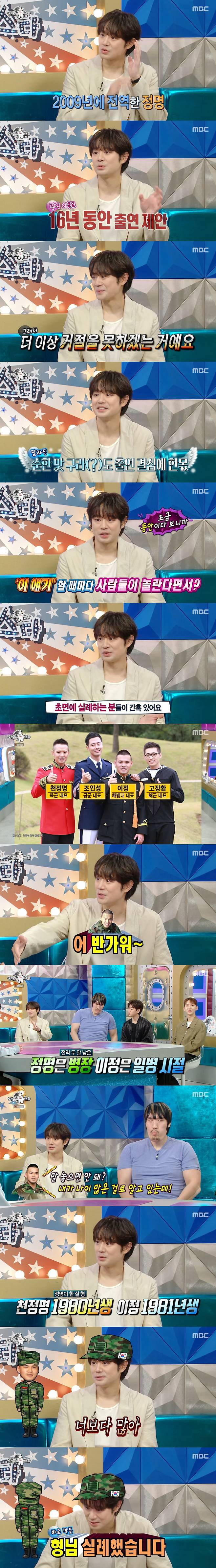 천정명은 "더 이상은 거절을 못하겠더라"면서 "또 다른 이유는 김구라 선배님 보면 독설가로 유명하시지 않나. 최근에는 순해진 것 같아서 출연을 하게 됐다"고 밝혔다.