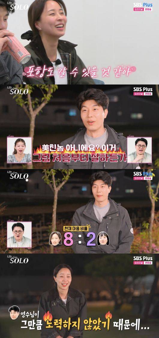 특히 영수는 “난 진짜 데이트 하고 싶다. 내일 한번 애기해보자 모든 걸 겪고 나서 마지막으로 지금은 포항도 갈 수 있을 것 같다”라고 고백했다. 이어진 인터뷰에서 그는 “미친 X 아니냐. 처음부터 잘하던가. 정리가 안되고 계속 미련이 많을수록 감정이 커지는 것 같다”라며 정숙과 영자에 대한 관심 비율로 8:2라고 전했다.