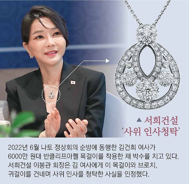 이 회장은 2022년 3월 대선 직후 당선 축하 명목으로 반클리프아펠 목걸이를 먼저 건넸고, 한 달 뒤인 4월엔 3000만 원 상당의 브로치와 2000만 원 상당의 귀걸이를 추가로 전달했다고 밝힌 것으로 전해졌다.