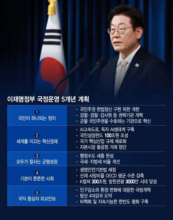 국정과제에는 AI(인공지능) 3대 강국과 잠재성장률 3% 달성 등 이 대통령이 대선에서 강조한 '진짜 성장' 비전도 구체화됐다. 국가 균형발전 과제로는 '5극3특' 중심의 혁신·일자리 거점 조성, 광역 교통망 연계, 행정수도 세종 완성, 국세·지방세 비율 개선 등이 담겼다. 5극3특은 수도권 집중 완화와 지역 균형발전을 위한 행정 체계로 수도권·동남권·대경권·중부권·호남권 등 5대 초광역권과 제주·강원·전북 등 3대 특별자치도로 구성된다.