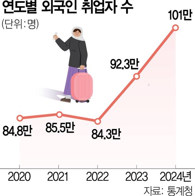 이 때문에 의류·섬유 공급망의 필수 축을 이루는 내수 염색 산업은 이주노동자들이 아니면 사실상 작동이 불가능해진 상태다. 2004년 고용허가제 도입을 기점으로 들어온 이주노동자들이 한국인 장기근속자들의 빈자리를 메우고 있다. 염색 업체들의 외국인 채용은 팬데믹 이후 내국인 구인난이 심화되면서 더욱 가속이 붙었다. 이런 변화는 농업·원양어업·건설업·제조업 같은 다른 산업 현장에서도 확인된다. 업계에서는 국내 조선소 종사자 중 외국인 인력의 비중이 이미 15% 이상이라고 본다. 통계청에 따르면 지난해 국내 외국인 취업자는 사상 처음으로 100만 명을 넘어섰다.