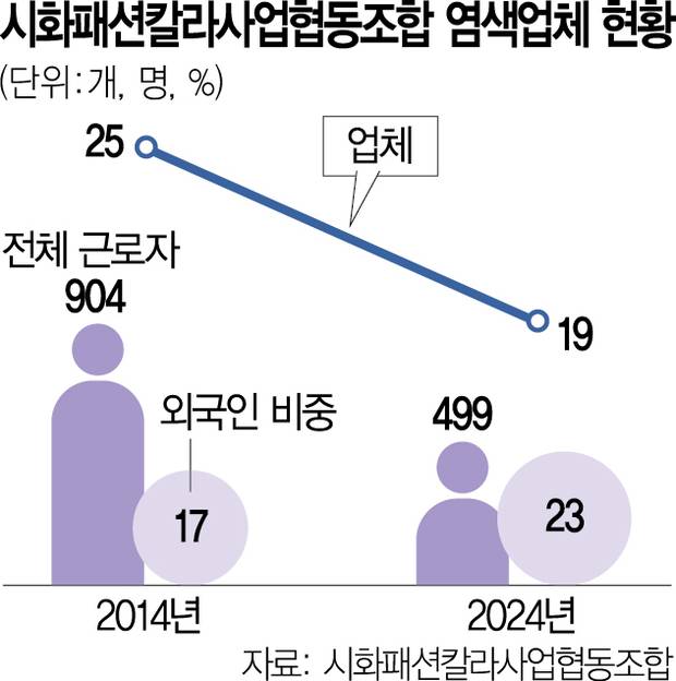 한국인 장기근속자들을 중심으로 오랜 기간 경쟁력을 유지해왔던 과거와는 완전히 달라진 풍경이다. 1990년대 초 수도권 중소 업체들이 모여 형성된 시화염색산단은 초창기 인근 지역 내국인 노동자들이 생산 전 과정을 책임졌다. 하지만 다른 제조업과 비교해도 임금이 낮은 데다 사회적으로도 ‘고된 일’이라는 인식이 자리 잡으며 상황이 달라졌다. 여기에는 값싼 중국·베트남산에 밀려 경쟁력을 잃은 점도 한몫했다.