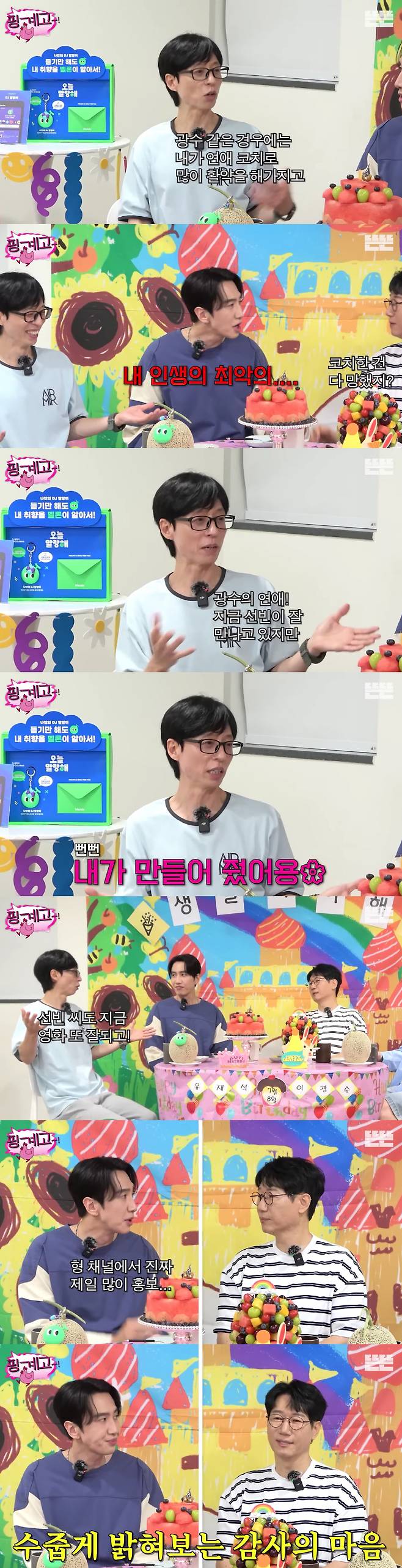 유재석은 "광수 같은 경우 내가 연애 코치로 많이 활약했다"며 이광수의 연애사를 언급했다. 이광수는 "내 인생 최악이었다"고 열변을 토했지만, 유재석은 "광수가 지금 선빈이 잘 만나고 있는데, 그 연애를 내가 만들어줬다고 해도 과언이 아니다"라며 뿌듯해 했다.