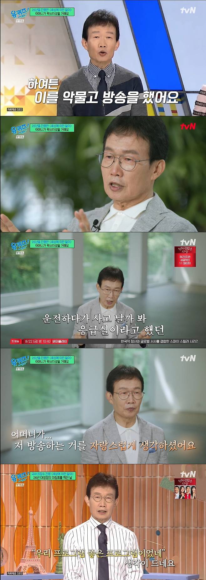 이어 "멍하니 어머니 사진을 보는데, 어머니가 평소에 '방송을 시작했으니 1순위를 방송으로 둬라'라 하셨었다. 어머니가 캐나다에서도 '세상에 이런 일이'를 빼놓지 않고 보시면서 모니터링을 하셨다. 나도 몰랐던 걸 어머니는 다 아셨다. 방송국에 다시 전화해 '내일 녹화하러 갈게요'라 했다. 그래서 비행기표를 바꾸고 녹화를 하러 갔다. 눈이 말도 못하게 부었다. 방송할 얼굴이 아니었다. 하필 마지막이 노모에게 효도하는 아들 사연이었다. 그걸 보는 순간에 참았던 눈물이 올라왔다. 녹화를 잠시 쉬었다가 다시 시작했다"라며 그때가 생각난듯 울컥했다.