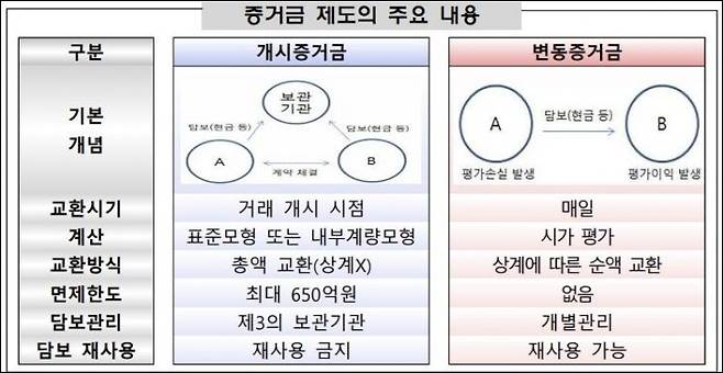 증거금 교환제도는 중앙청산소(CCP)에서 청산되지 않는 장외파생상품 거래에 대해 거래 당사자 간에 부도 위험과 일일 손익 변동을 관리하기 위해 담보를 사전에 주고받는 제도다. 개시증거금은 거래시점에 거래 상대방의 미래의 부도 위험을, 변동증거금은 일일 익스포저를 관리하기 위해 교환하는 담보를 말한다.