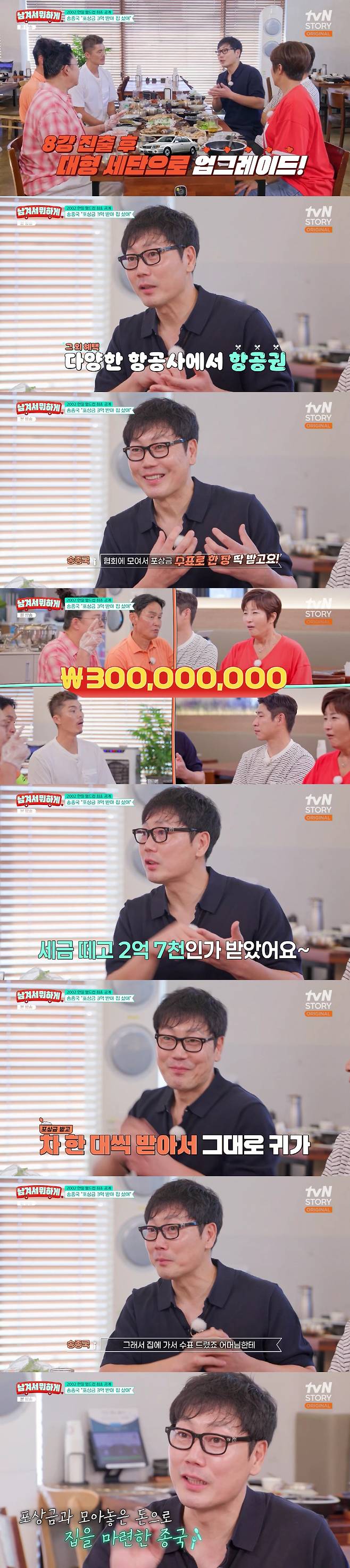 그는 "그때 선수 스물 세 명 모두 받았다. 기억에 남는 건 저희가 협회에 모여서 포상금 수표를 받았다"면서 "3억 원이었는데, 세금 떼고 2억 7천만원을 받았다"고 말해 모두를 놀라게 했다.
